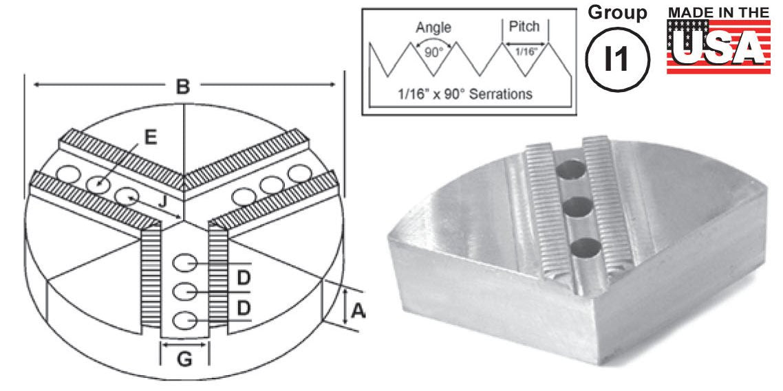 | Group No | Chuck Size | Groove Width G | Screw Size E | Hole Space D | Hole to Front J | Middle Hole to Front Jm | Pie Dia B | Height Inch A | No. of Holes | Industry Ref # | Part Number | Part Number | Part Number |