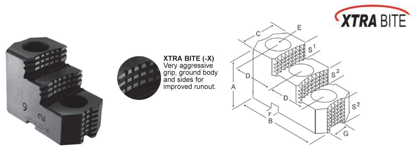 • XTRA BITE (-X) -very aggressive bite. Has conical teeth for extra gripping power and ground body to provide improved runout.