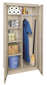 •Durable welded steel construction combined with quiet door closure make these cabinets ideal for office, factory or warehouse •Available in extra wide cabinets to provide up to 40% more storage space than standard size cabinets •All cabinets feature recessed handle with three-point locking system •Three sets of hinges and fully welded door stiffener to maintain door alignment and rigidity •Shelves adjust on 2" centers •Combination Cabinets (C) include one full width shelf, three half shelves and hanger rod •Transport Cabinets (D) include patented reinforced heavy-duty caster base with 5" swivel polypropylene casters (2 locking) for effortless mobility •Optional Side Push Handle (E) mounts to either side of transport cabinet to provide easier control when moving •Meets ANSI/BIFMA shelf capacity standards •Durable finish available in tropic sand, light gray, charcoal or black
